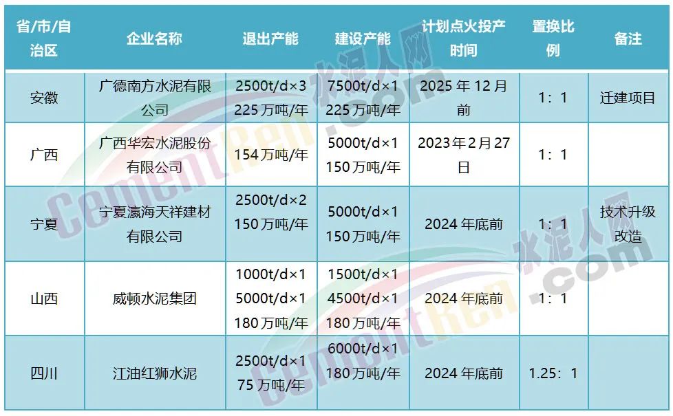 安徽廣德南方水泥有限公司退出三條2500噸/日水泥熟料生產線產能用于廣德南方水泥有限公司7500噸/日新型干法水泥熟料生產線遷建項目產能置換。新建線計劃于2025年12月前點火投產,三條退出生產線將于新建線投產后三個月內關停,粉磨系統也將于項目投產后關停。退出窯、磨等設備將于關停后一年內拆除。
