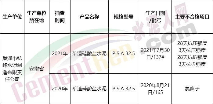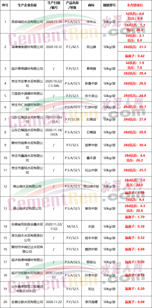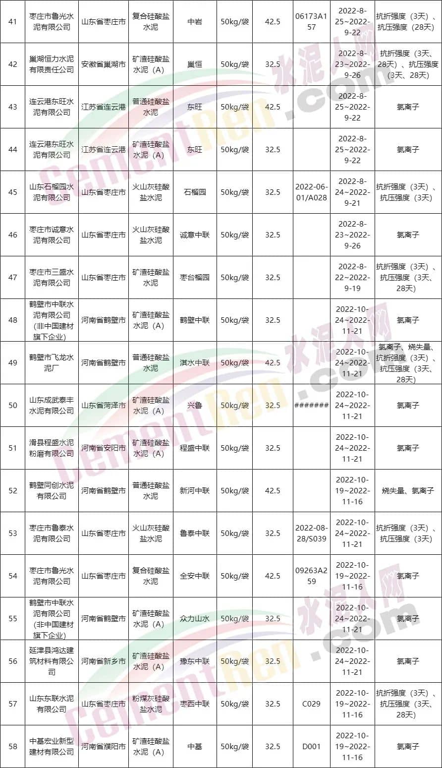 21個批次不合格品中,11個批次強度不合格,9個批次氯離子不合格,1個批次水溶性六價鉻不合格。不合品有12個批次是在流通領域被發現,9個批次為生產領域抽檢發現。其中包括32.5標號水泥13個批次,42.5水泥8個批次。不合格品中不僅包含高仿品牌、無效注冊商標,還存在兩批次“假冒產品”。