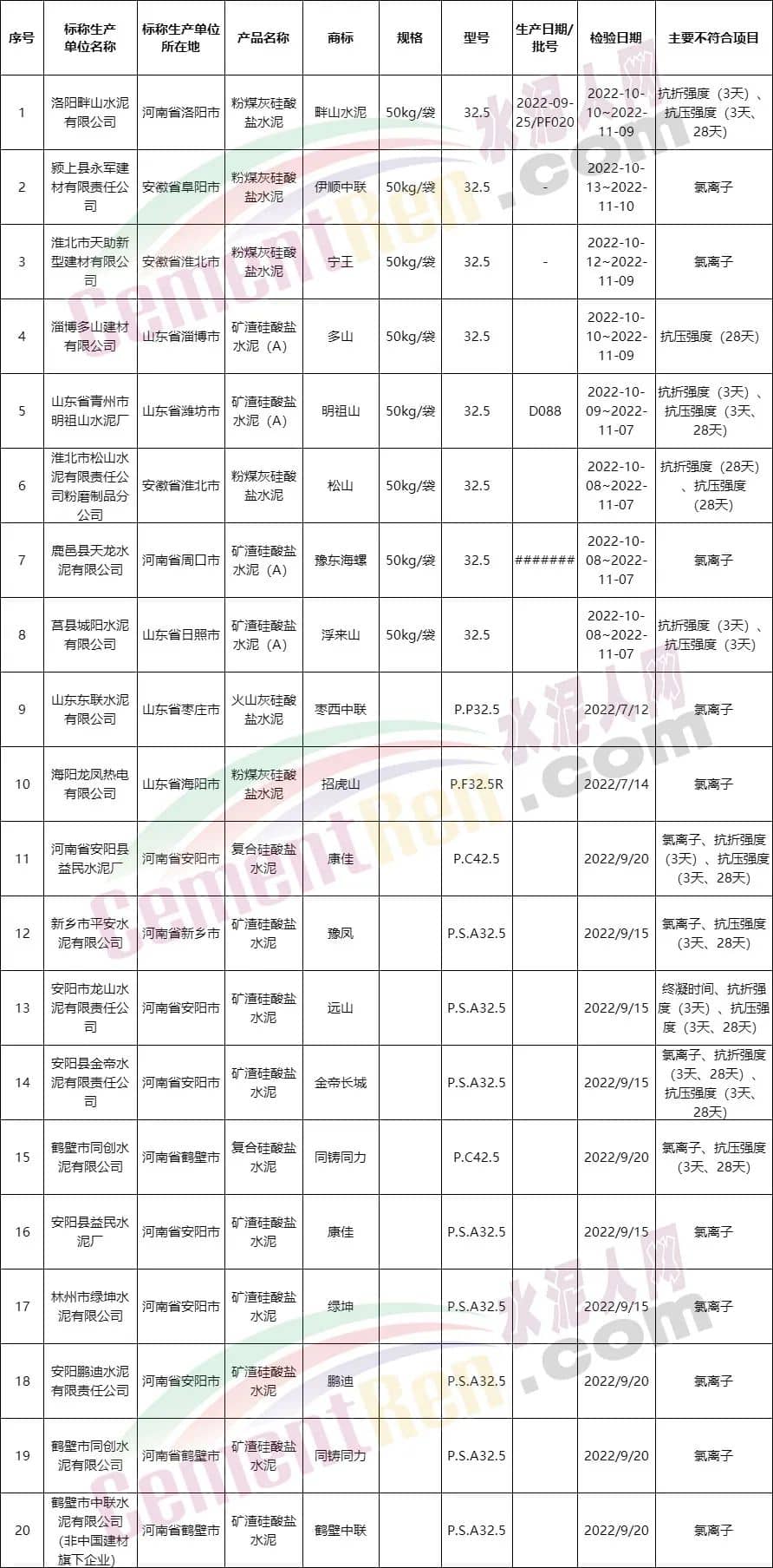 水泥質量萬里行組委會通報部分不合格品名單