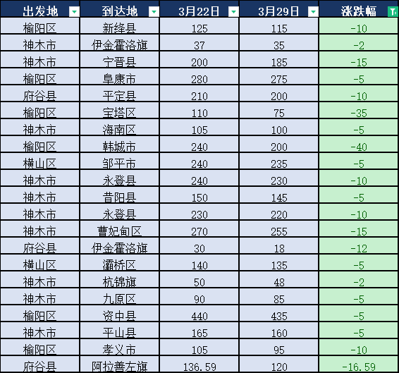 3月下旬榆林煤炭公路運費參考