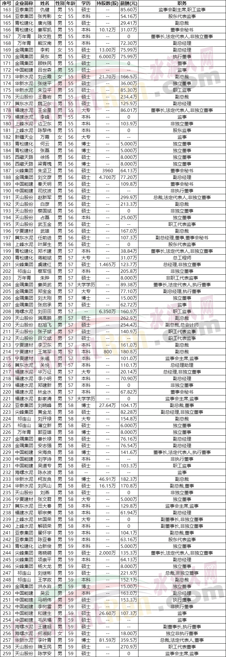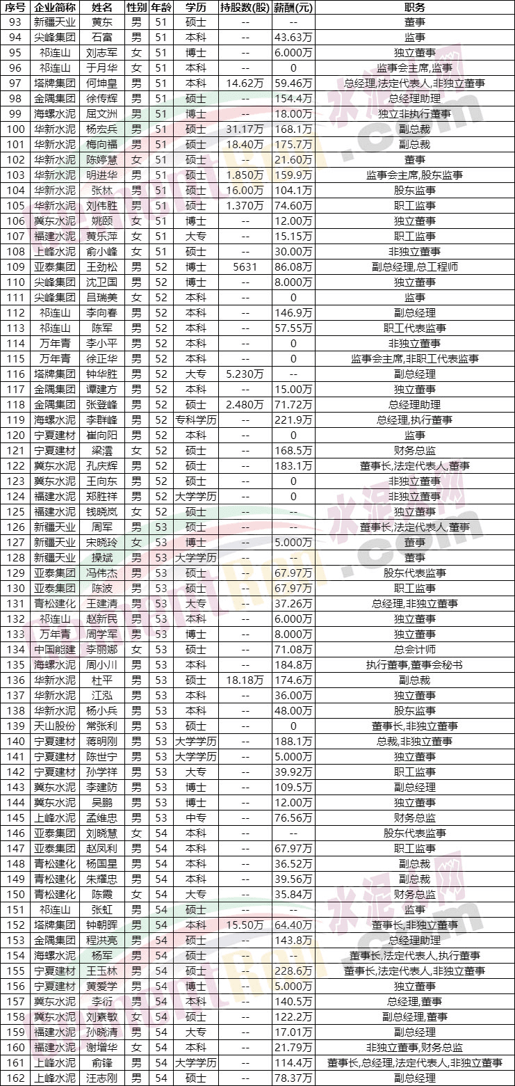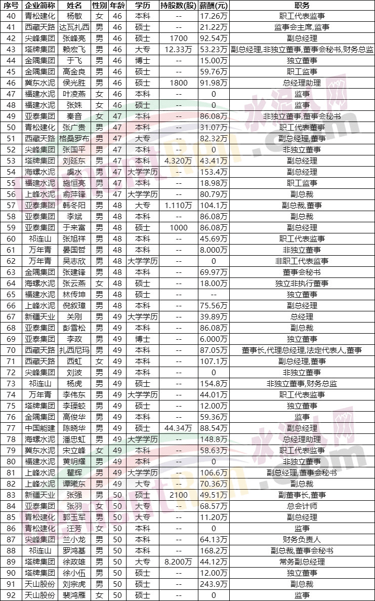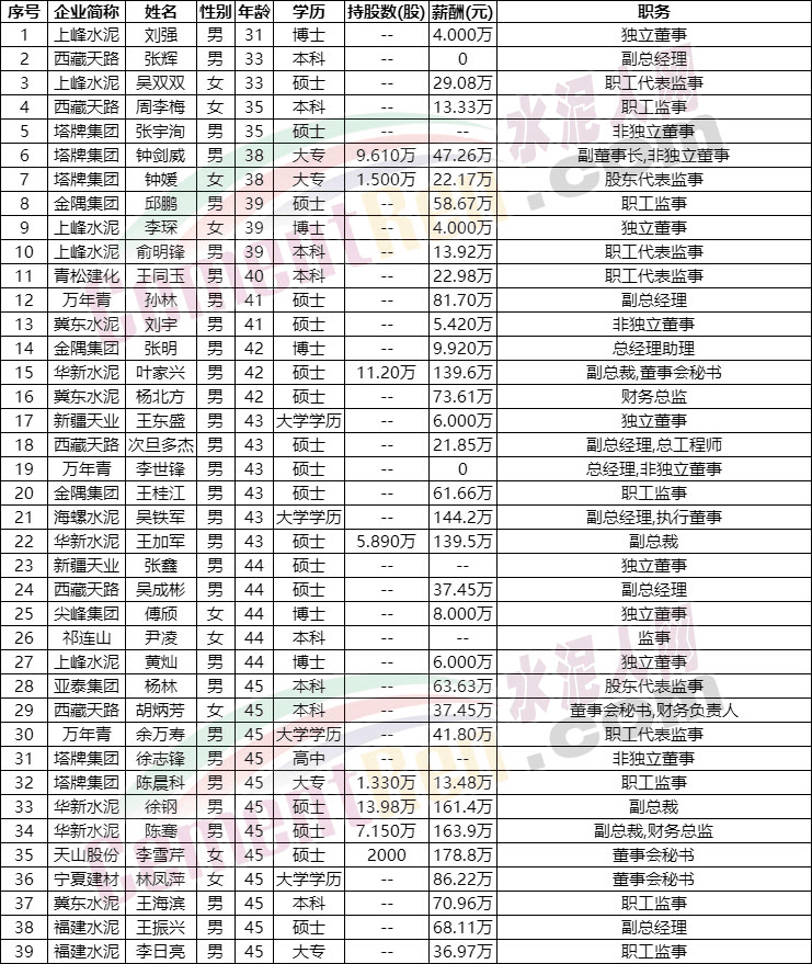 據水泥人網了解,部分水泥集團已明確年齡在58歲的高管退居二線,從上市公司公布的數據也可見出生于1970-1980年間的管理層為目前行業的主力,且多為本科及以上學歷。
