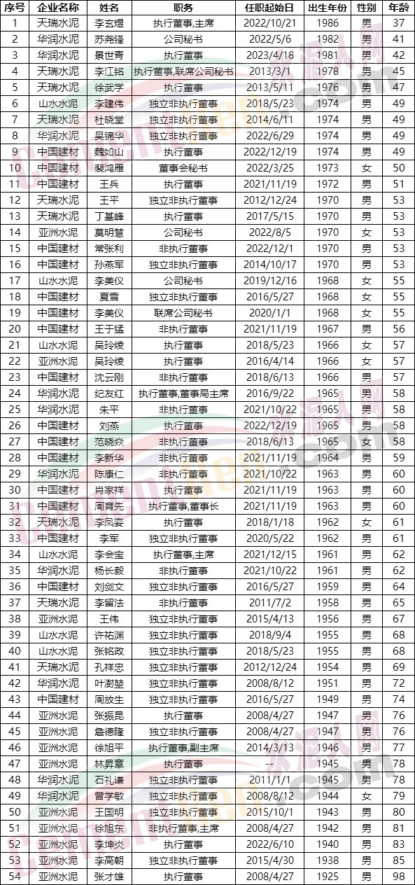 港股上市公司華潤水泥、山水水泥、天瑞水泥、亞洲水泥、中國建材等五家企業54位高管中50歲以下的高管僅有9位,50-59歲年齡段共有19位,60歲以上共有20位。港股上市水泥企業中年齡最小的高管為天瑞水泥執行董事,董事會主席李玄煜。其簡歷顯示出生年月為1986年。李玄煜為天瑞水泥創始人李留法之子。年齡最大的為亞洲水泥執行董事張才雄,1925生人,今年98歲。