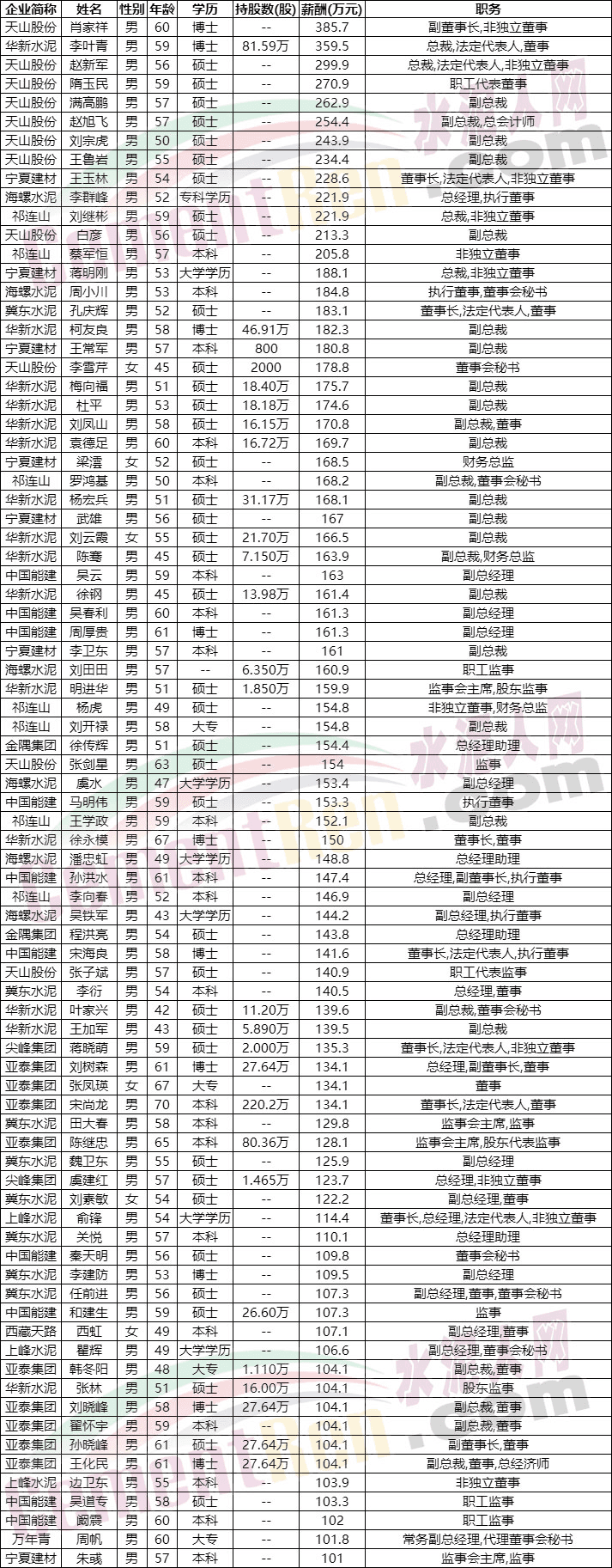 從上市公司已公布數據可見,薪酬在200萬以上的高管中,除李葉青持有企業股份外,包括海螺水泥總經理李群峰、寧夏建材董事長王玉林以及祁連山水泥總裁劉繼彬,非獨立董事蔡軍恒以及天山股份的多位高管均未持有公司股份。