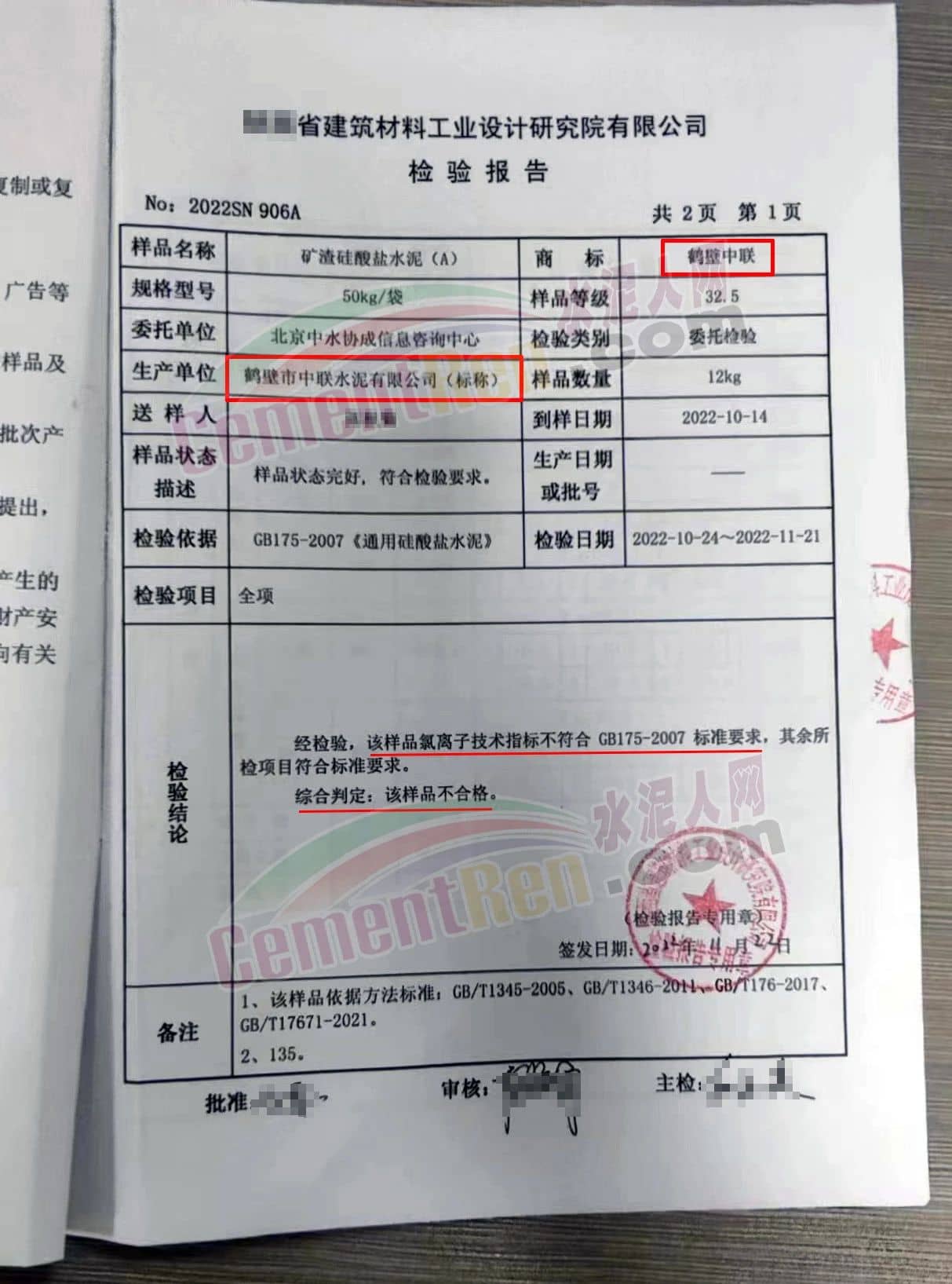 據水泥質量萬里行組委會反饋,在抽檢的不合格水泥中,包括標稱生產單位為鶴壁市中聯水泥有限公司(以下簡稱“鶴壁市中聯水泥”該企業非中國建材集團旗下企業)旗下的“眾力山水”和標稱為“鶴壁中聯”牌的兩個批次P.S.A32.5礦渣硅酸鹽水泥樣品委托檢驗報告檢驗結論均為“氯離子技術指標不符合GB175-2007標準要求,綜合判定為該樣品不合格”。