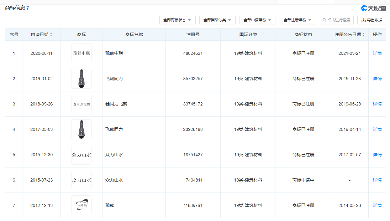 企業共有7條商標信息,豫鶴中聯、飛鶴同力、鑫同力飛鶴、眾力山水、豫鶴等6個商標分別在2014年5月28日到2021年3月21日期間注冊完成。