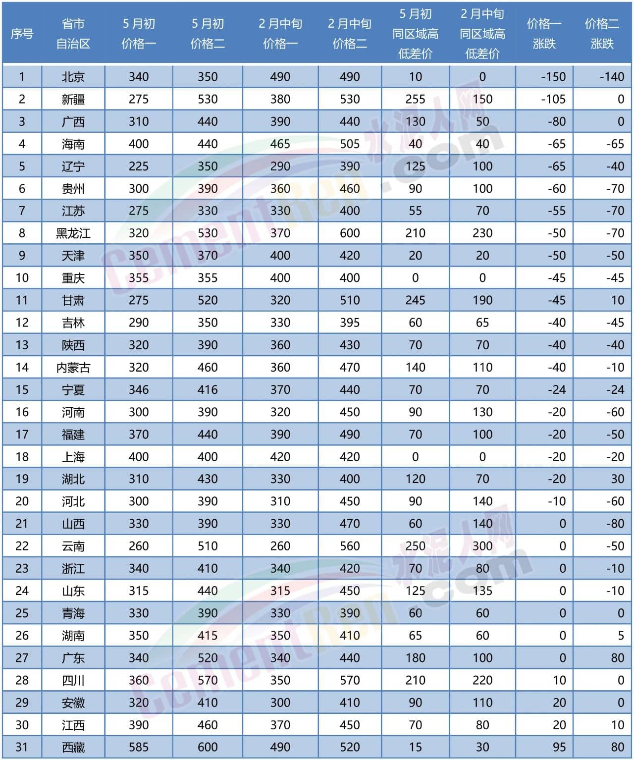 備注:上述各區域報價來自水泥人網信息中心人工采集,僅供參考,如與實際成交價格不符,請以實際成交價格為準。