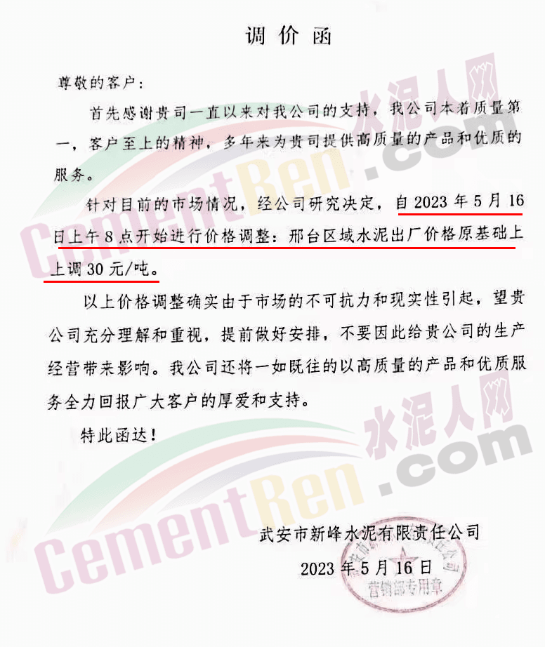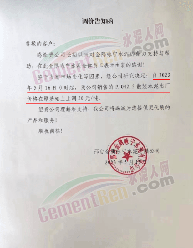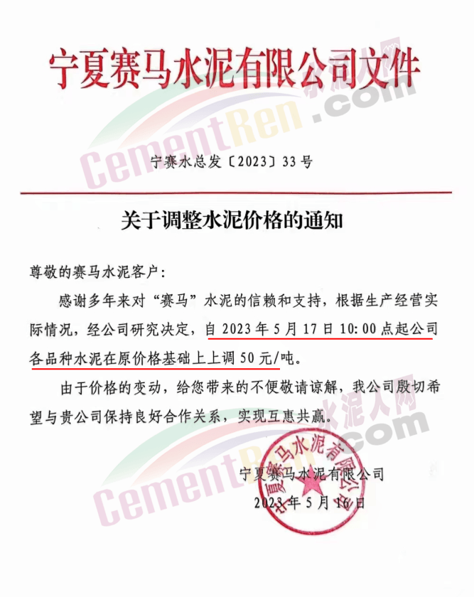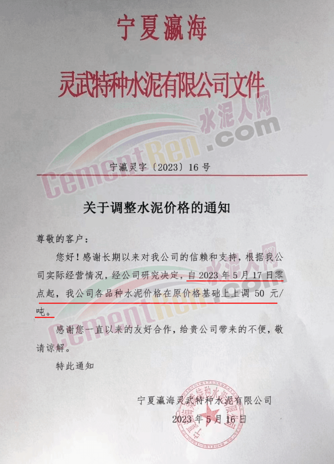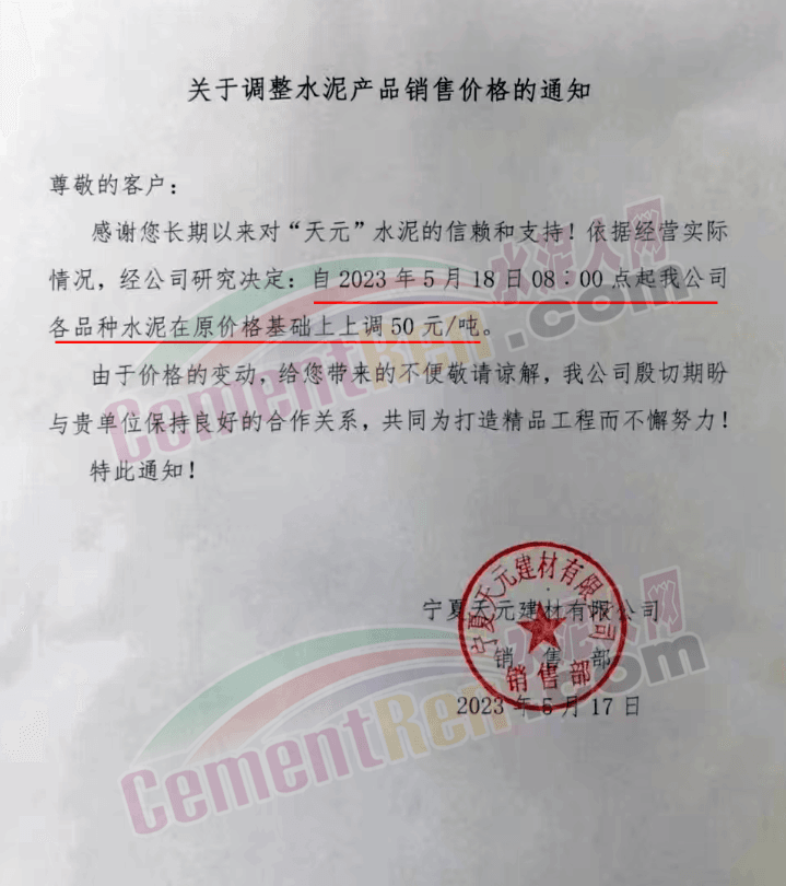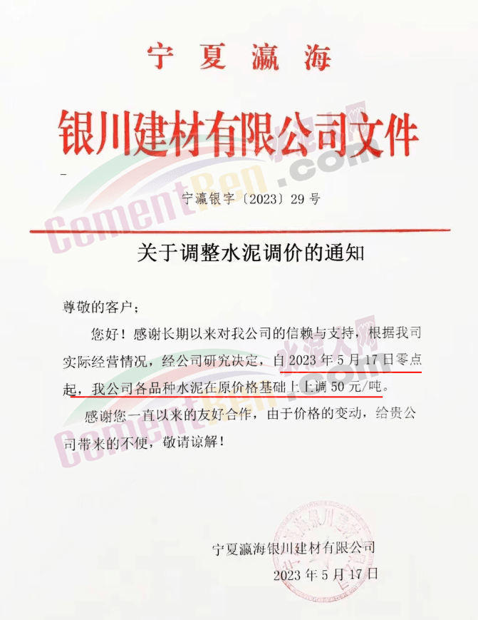 寧夏瀛海天琛建材有限公司通知,根據公司實際經營情況,現決定,自2023年5月17日零點起,各品種水泥在原價格基礎上上調50元/噸。