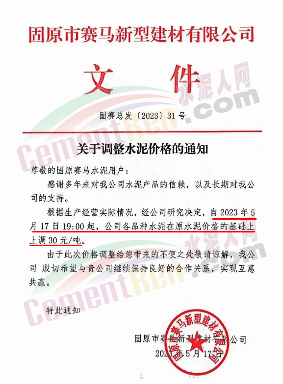 固原市賽馬新型建材有限公司通知根據生產經營實際情況,經公司研究決定,自5月17日19時起,公司各品種水泥在原水泥價格的基礎上上調30元/噸。