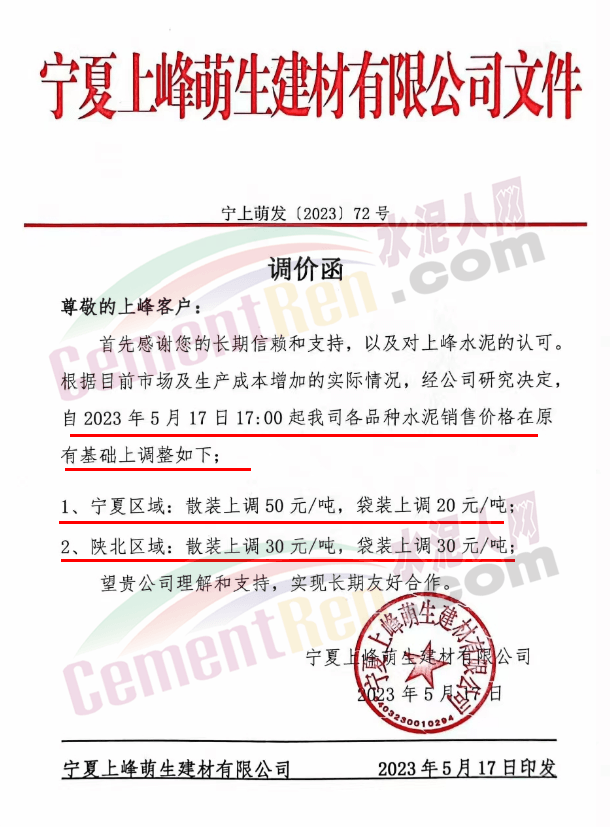寧夏上峰萌生建材有限公司通知根據目前市場及生產成本增加的實際情況,經公司研究決定自5月17日17時起公司各品種水泥銷售價格在原有基礎上調整。其中寧夏區域:散裝上調50元/噸,袋裝上調20元/噸;陜北區域:散裝上調30元/噸,袋裝上調30元/噸。