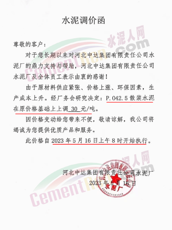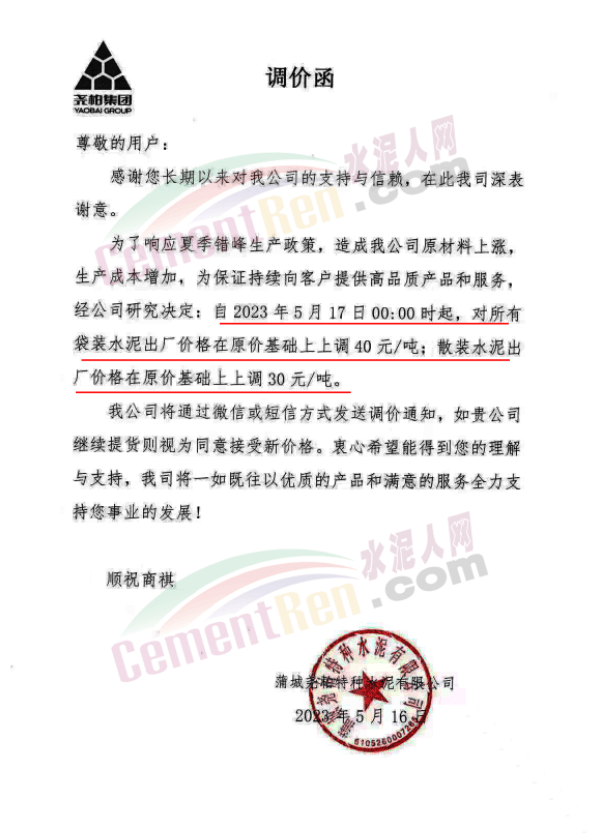 同日,蒲城堯柏特種水泥有限公司通知,為了響應夏季錯峰生產政策,造成公司原材料上漲,生產成本增加,為保證持續向客戶提供高品質產品和服務。經公司研究決定:自5月17日0時起,對所有袋裝水泥出廠價格在原價基礎上上調40元/噸;散裝水泥出廠價格在原價基礎上上調30元/噸。