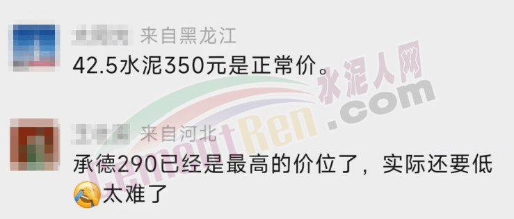 來自黑龍江的網友表示,42.5水泥350元/噸是正常價;來自河北的網友表示,承德P.O42.5水泥290元/噸是最高的價位了,實際還要低。