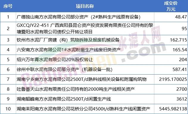 10個(gè)已成交項(xiàng)目中,除廣西賓陽(yáng)縣昆侖資產(chǎn)投資發(fā)展有限責(zé)任公司持有的黎塘暨陽(yáng)水泥有限公司債權(quán)公開(kāi)轉(zhuǎn)讓及紹興萬(wàn)年青水泥有限公司20%股權(quán)轉(zhuǎn)讓外,其他均為機(jī)器設(shè)備或生產(chǎn)線閑置資產(chǎn)。且主要為中國(guó)建材集團(tuán)旗下南方水泥、天山水泥、中聯(lián)水泥等企業(yè)閑置資產(chǎn)。