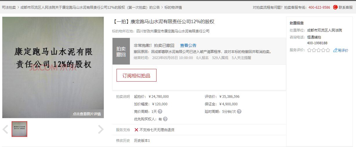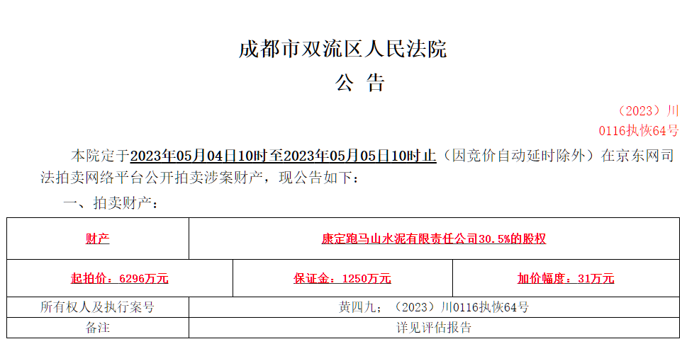 3月29日,成都市雙流區(qū)人民法院發(fā)布拍賣(mài)公告(川0116執(zhí)恢64號(hào))提到定于5月4日10時(shí)至5月5日10時(shí)在京東網(wǎng)司法拍賣(mài)網(wǎng)絡(luò)平臺(tái)公開(kāi)拍賣(mài)涉案財(cái)產(chǎn)。拍賣(mài)財(cái)產(chǎn)為康定跑馬山水泥有限責(zé)任公司12%的股權(quán),起拍價(jià)2478萬(wàn)元。