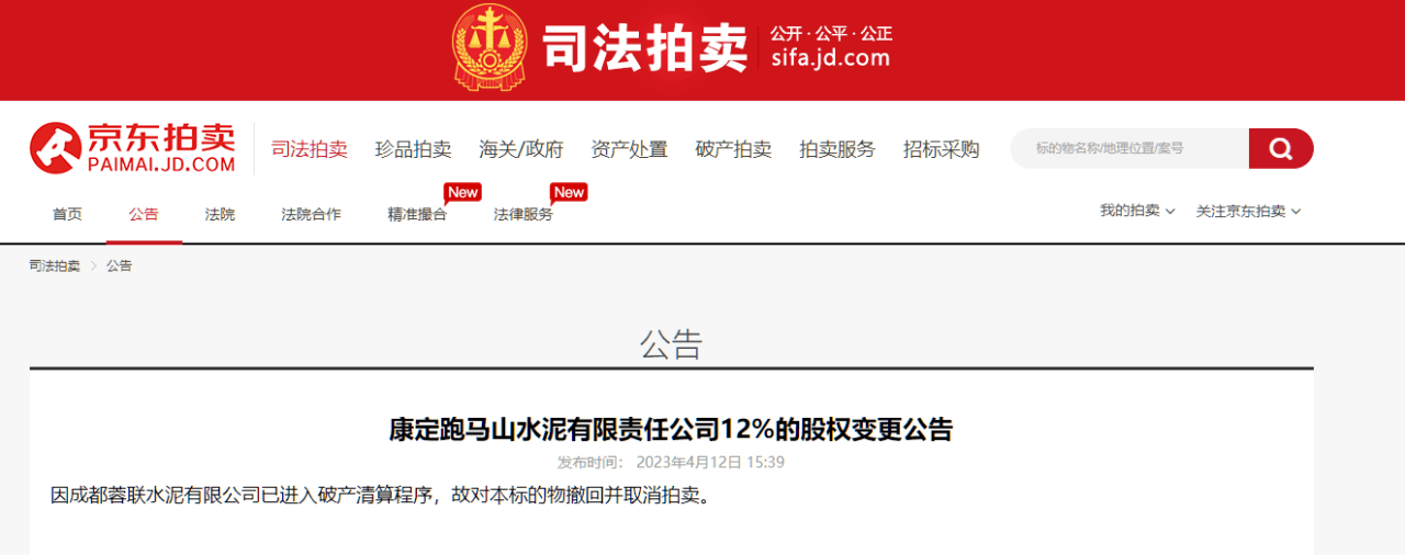 從京東司法拍賣(mài)平臺(tái)可見(jiàn),成都蓉聯(lián)水泥有限公司已進(jìn)入破產(chǎn)清算程序,故對(duì)本標(biāo)的物撤回并取消拍賣(mài)。
