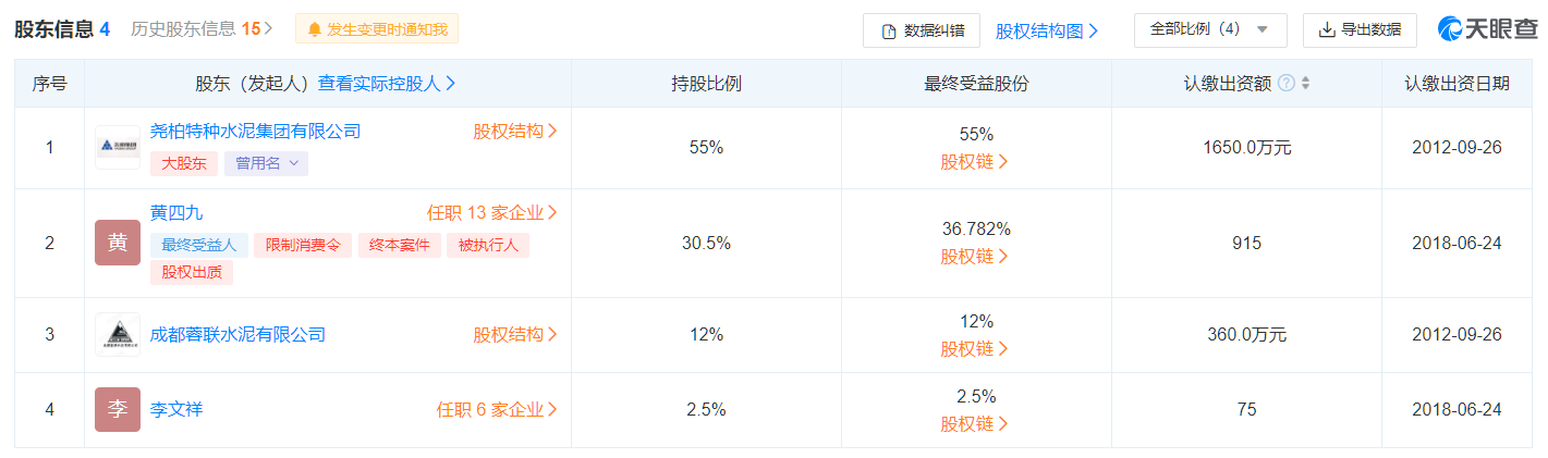 成都蓉聯(lián)水泥有限公司為何能影響康定跑馬山水泥有限責(zé)任公司的股權(quán)出售呢?從企業(yè)股權(quán)結(jié)構(gòu)可見(jiàn),康定跑馬山水泥有限責(zé)任公司由堯柏特種水泥持股55%,黃四九持股30.5%,成都蓉聯(lián)水泥有限公司持股12%,李文祥持股2.5%。