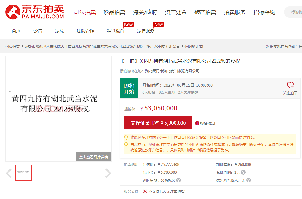 京東資產(chǎn)交易平臺(tái)另有信息顯示,黃四九持有的湖北武當(dāng)水泥有限公司18%、22.2%的股權(quán)也即將拍賣(mài),起拍價(jià)分別為4301萬(wàn)元、5305萬(wàn)元。湖北武當(dāng)水泥有限公司成立于2006年,位于湖北省十堰市鄖西縣城關(guān)鎮(zhèn),該公司擁有一座2500t/d全能工廠。湖北武當(dāng)水泥有限公司由黃四九持股99%。