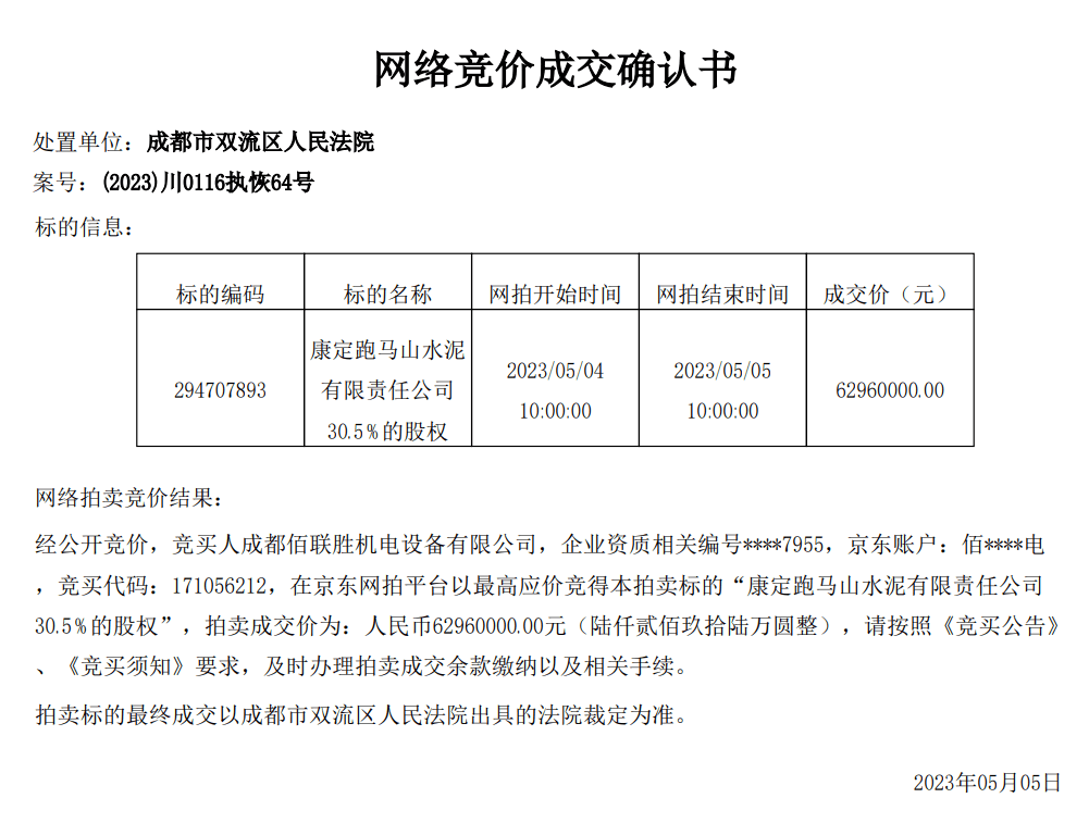 同期,康定跑馬山水泥有限責(zé)任公司30.5%的股權(quán)于5月5日被成功拍出,并未受到成都蓉聯(lián)水泥有限公司破產(chǎn)的影響。成交確認(rèn)書(shū)顯示,經(jīng)公開(kāi)競(jìng)價(jià),競(jìng)買(mǎi)人成都佰聯(lián)勝機(jī)電設(shè)備有限公司在京東網(wǎng)拍平臺(tái)以最高價(jià)競(jìng)得本拍賣(mài)標(biāo)的,拍賣(mài)成交價(jià)為6296萬(wàn)元。