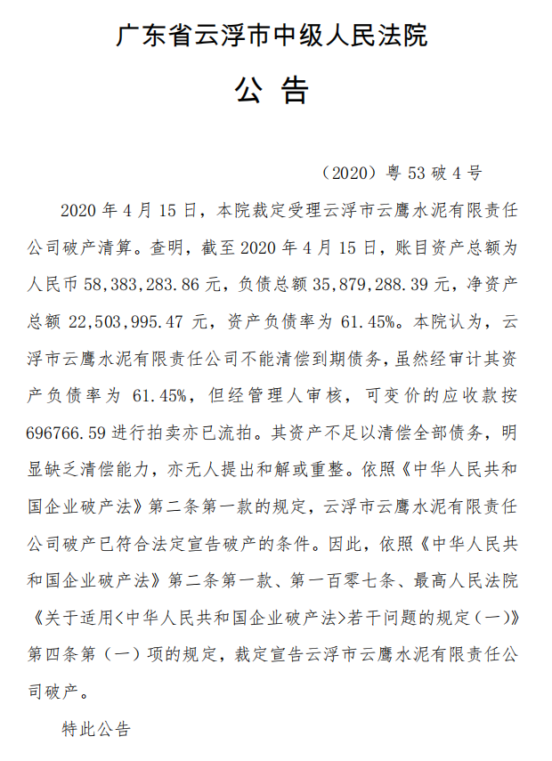 2020年4月15日,廣東省云浮市中級人民法院裁定受理云浮市云鷹水泥有限責(zé)任公司破產(chǎn)清算,并裁定宣告云浮市云鷹水泥有限責(zé)任公司破產(chǎn)。