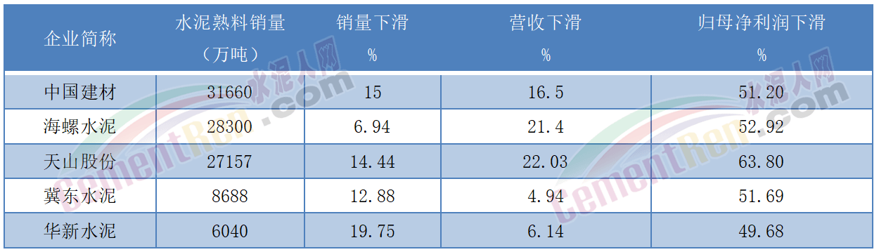 對比中國建材、海螺水泥、天山股份、冀東水泥、華新水泥五家企業銷量下滑幅度可見,海螺水泥的銷量下滑相對較小。