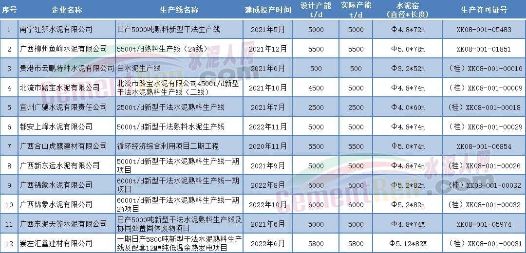 2020-2022年年間廣西區域12條新建線投產,涉及企業包括紅獅水泥、魚峰水泥、寶路水泥、廣馳水泥、合山虎鷹、新東運水泥、錦象水泥、東泥天等等多家企業。