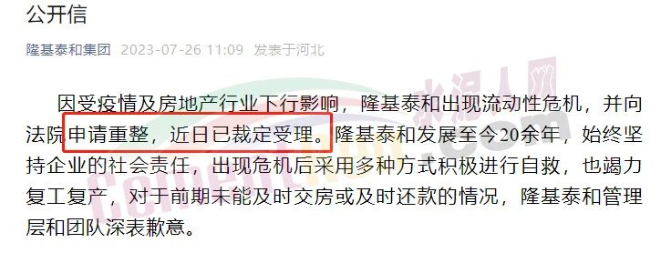 近日,隆基泰和發(fā)布公開信,因受疫情及房地產(chǎn)行業(yè)下行影響,企業(yè)出現(xiàn)流動(dòng)性危機(jī),并向法院申請(qǐng)重整,近日已裁定受理。其還表示,出現(xiàn)危機(jī)后采用多種方式積極進(jìn)行自救,也竭力復(fù)工復(fù)產(chǎn),對(duì)于前期未能及時(shí)交房或及時(shí)還款的情況,隆基泰和管理層和團(tuán)隊(duì)深表歉意。