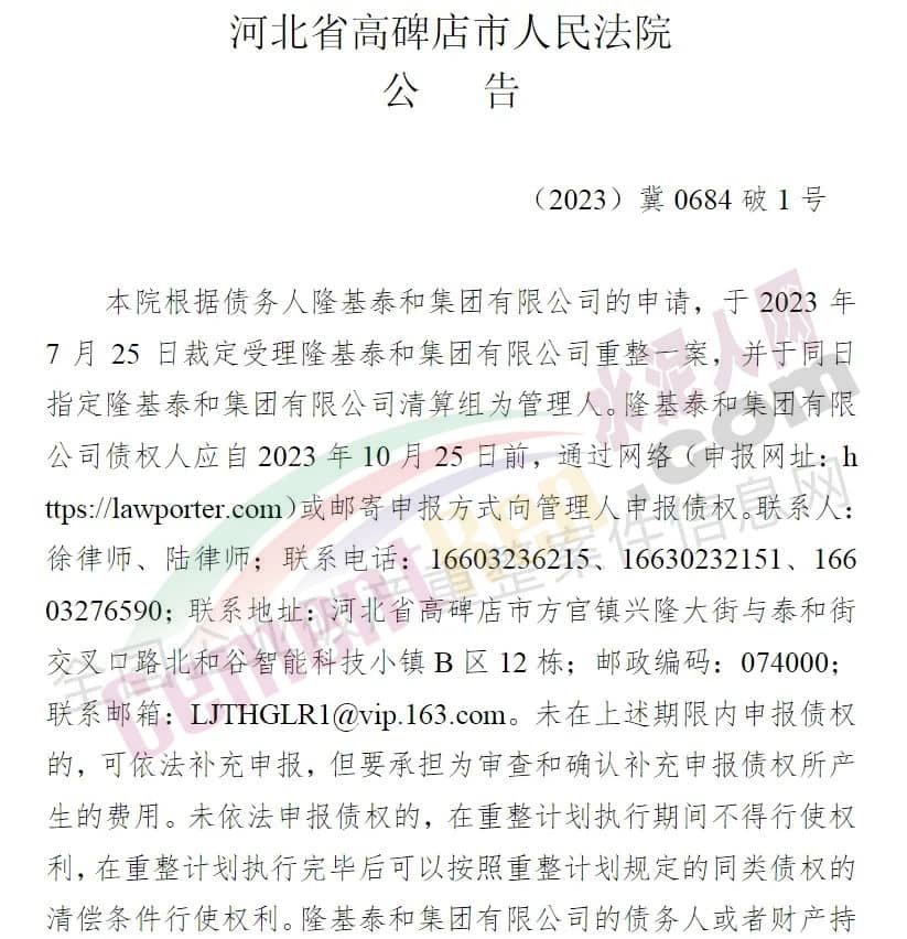 據(jù)水泥人網(wǎng)了解,7月25日,隆基泰和集團(tuán)新增一起破產(chǎn)重整案件,破產(chǎn)重整的申請(qǐng)人和被申請(qǐng)人均為隆基泰和集團(tuán),經(jīng)辦法院為河北高碑店法院。另外,高碑店市人民法院定于2023年11月9日上午9時(shí)30分通過網(wǎng)絡(luò)會(huì)議形式召開第一次債權(quán)人會(huì)議,依法申報(bào)債權(quán)的債權(quán)人有權(quán)參加債權(quán)人會(huì)議。
