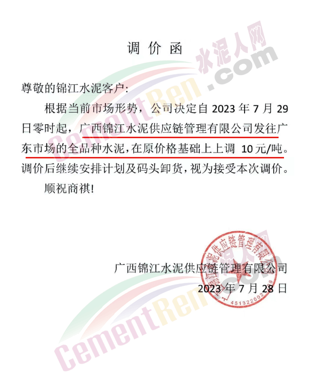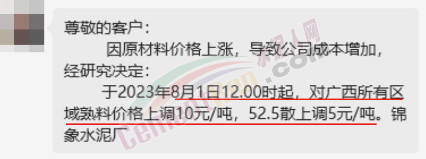 水泥人網消息:日前,廣西錦象水泥通知,因原材料價格上漲,導致公司成本增加,經研究決定:于2023年8月1日12時起,對廣西所有區域熟料價格上調10元/噸,52.5散上調5元/噸。