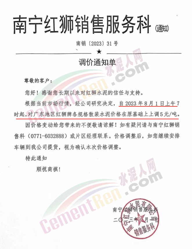 同期,南寧紅獅銷售服務科通知,根據當前市場行情,經公司研究決定,自2023年8月1日上午7時起,對廣東地區紅獅牌各規格散裝水泥價格在原基礎上上調5元/噸。