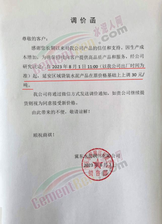 同日,陜西冀東水泥銅川公司通知,因生產成本增加,為確保持續向客戶提供高品質產品和服務,經公司研究決定,自2023年8月1日11時起,延安區域袋裝水泥產品在原價格基礎上上調30元/噸。