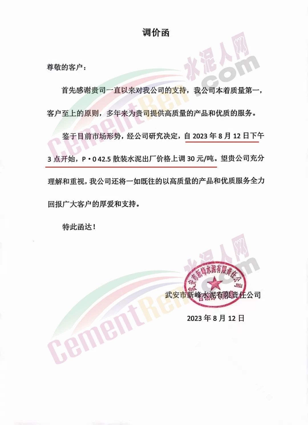 日前,武安市新峰水泥有限責任公司通知,鑒于目前市場形勢,經公司研究決定,自2023年8月12日下午3點開始,P.O42.5散裝水泥出廠價格上調30元/噸。