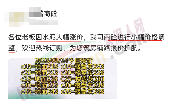 某商砼企業通知,因水泥大幅漲價,商砼進行小幅價格調整。調整后C30地面233元/方,樓盤灰238元/方。
