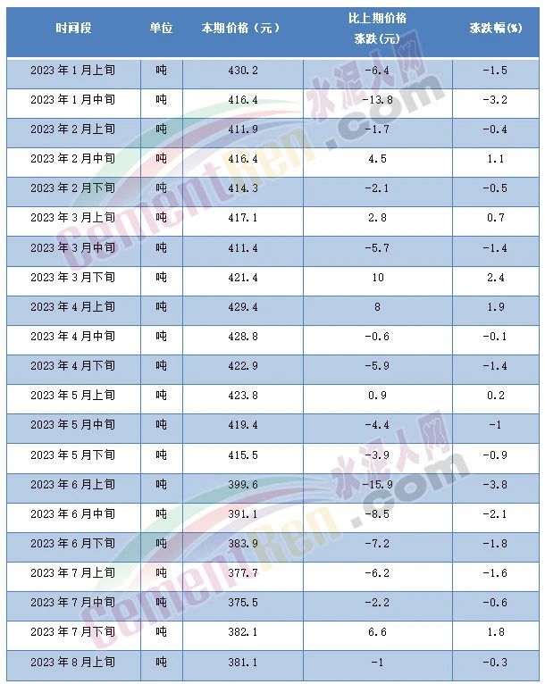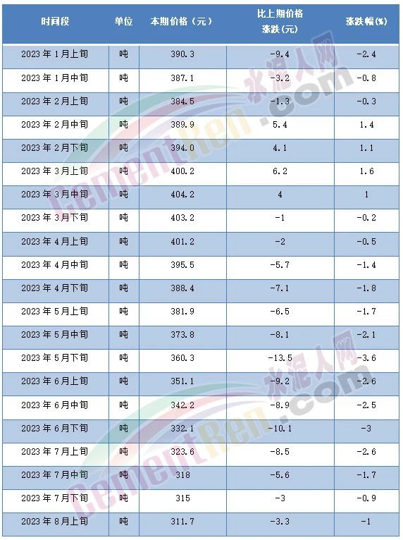 8月14日,國家統計局發布的2023年8月上旬流通領域重要生產資料市場價格變動情況顯示,普通硅酸鹽水泥(P.O42.5散裝)水泥報價311.7元/噸,且為自5月上旬以來第10次突破年內最低價。