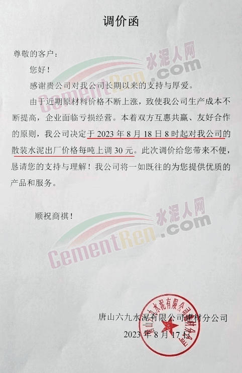 灤縣磐石水泥有限公司通知稱,由于近期企業環保投入以及煤炭等原燃材料不斷增加,致使水泥成本不斷提高。根據成本增長和市場情況,自2023年8月18日8時起水泥產品出廠價格在原價格基礎上每噸上調30元。