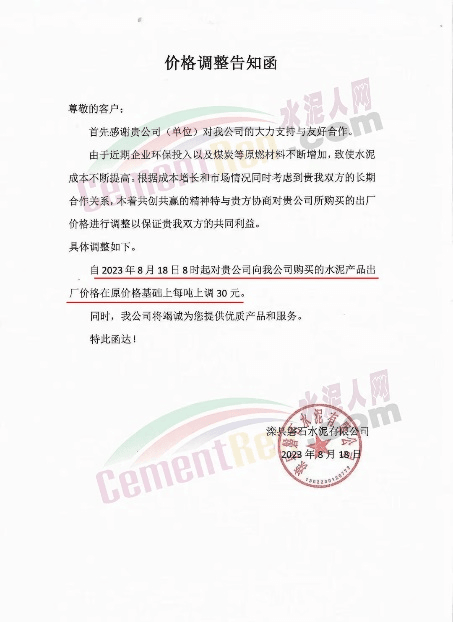 唐山圣龍水泥有限公司通知稱,由于近期企業環保投入以及煤炭等原燃材料不斷增加,致使水泥成本不斷提高。根據成本增長和市場情況,自2023年8月18日8時起,水泥出廠價格在原價格基礎上每噸上調30元。