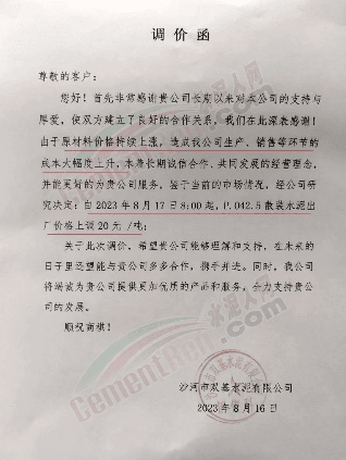 天津山水水泥有限公司通知稱,受原材料及運輸高成本影響,導致公司水泥制造成本居高不下。為保障公司正常生產運行,繼續為客戶提供優質產品及服務,經研究決定自2023年8月18日起所有品種水泥出廠價在原價格基礎上上調30元/噸。