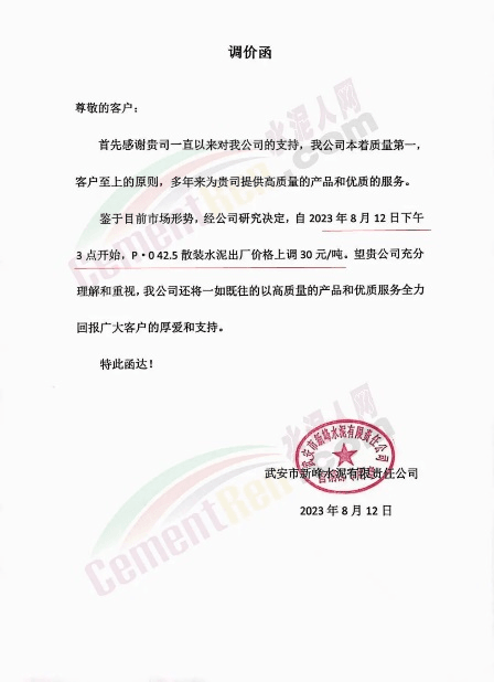 天津市金晟華水泥股份有限公司通知稱,由于市場變化等因素,經公司研究決定自2023年8月17日20:00時起,對PO42.5級水泥出廠價上調30元/噸。