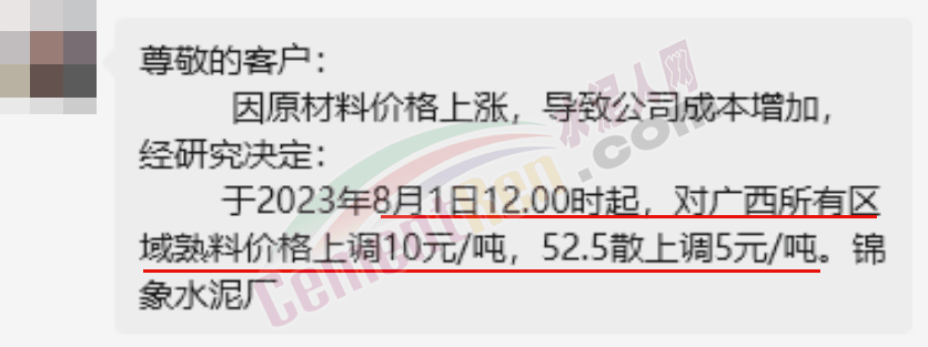 廣西錦象水泥通知,因原材料價格上漲,導致成本增加,自8月1日12:00時起,對廣西所有區域熟料價格上調10元/噸,52.5散裝水泥價格上調5元/噸。