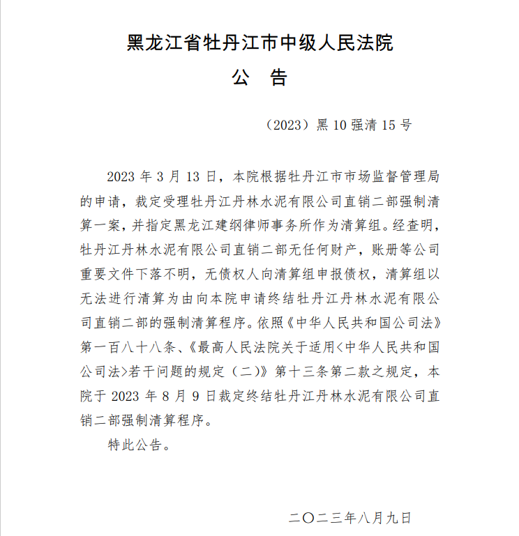 8月9日,黑龍江省牡丹江市中級(jí)人民法院公告,經(jīng)查明,牡丹江丹林水泥有限公司直銷二部無任何財(cái)產(chǎn),賬冊(cè)等公司重要文件下落不明,無債權(quán)人向清算組申報(bào)債權(quán),清算組以無法進(jìn)行清算為由向本院申請(qǐng)終結(jié)牡丹江丹林水泥有限公司直銷二部的強(qiáng)制清算程序,本院裁定終結(jié)牡丹江丹林水泥有限公司直銷二部強(qiáng)制清算程序。