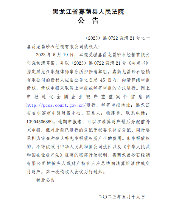 5月19日,黑龍江省嘉蔭縣人民法院公告,2023 年 5 月 19 日,本院受理嘉蔭龍昌砂石經(jīng)銷有限公司強(qiáng)制清算案,并指定黑龍江率航律師事務(wù)所擔(dān)任清算組。嘉蔭龍昌砂石經(jīng)銷有限公司的債權(quán)人應(yīng)自公告之日起 45 日內(nèi),向清算組申報(bào)債權(quán)。