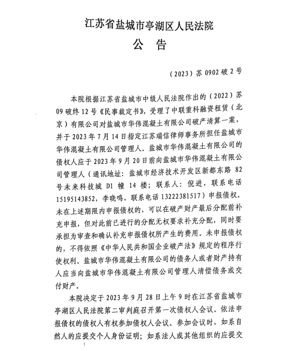 8月6日,江蘇省鹽城市亭湖區(qū)人民法院公告,本院受理了中聯(lián)重科融資租賃(北京)有限公司對(duì)鹽城市華偉混凝有限公司破產(chǎn)清算一案,并于 2023 年7月14日指定江蘇瑞信律師事務(wù)所擔(dān)任鹽城市華偉混凝土有限公司管理人,決定于2023 年9月 28日上午9 時(shí)在江蘇省鹽城市亭湖區(qū)人民法院第二審判庭召開第一次債權(quán)人會(huì)議。