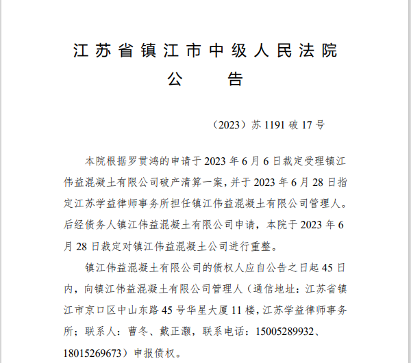 8月4日,江蘇省鎮(zhèn)江市中級(jí)人民法院公告,本院于2023年6月6日裁定受理鎮(zhèn)江偉益混凝土有限公司破產(chǎn)清算一案,并于2023年6月28日裁定對(duì)鎮(zhèn)江偉益混凝土公司進(jìn)行重整,本院定于2023年9月28日上午9時(shí)30分在本院大法庭通過現(xiàn)場(chǎng)和網(wǎng)絡(luò)直播的方式召開第一次債權(quán)人會(huì)議。