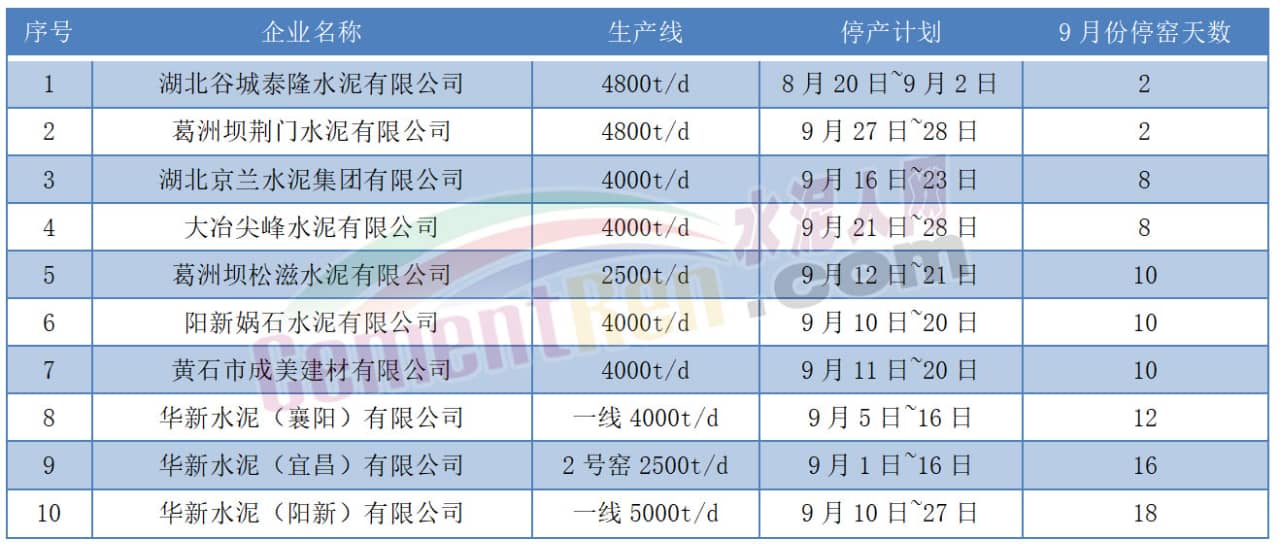 湖北22家水泥企業(yè)23條熟料線三季度停產(chǎn),9月份最長停窯18天