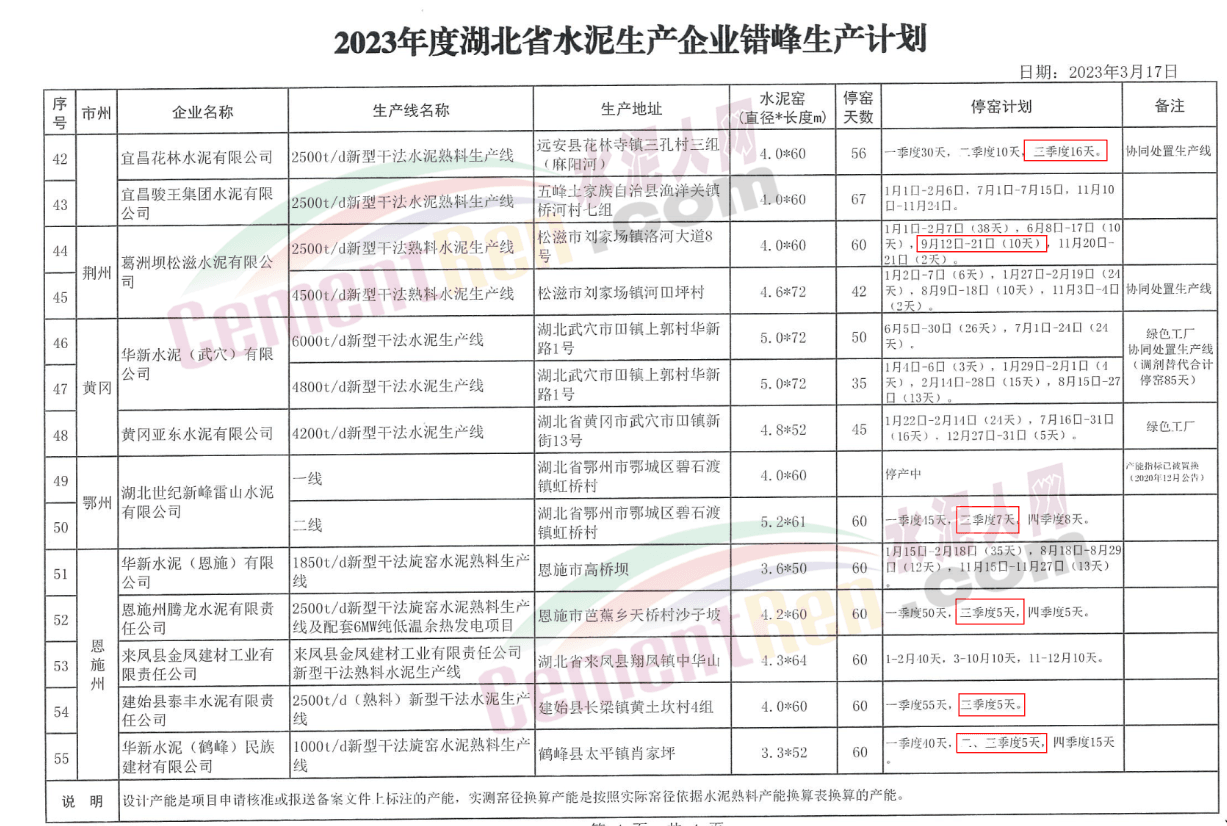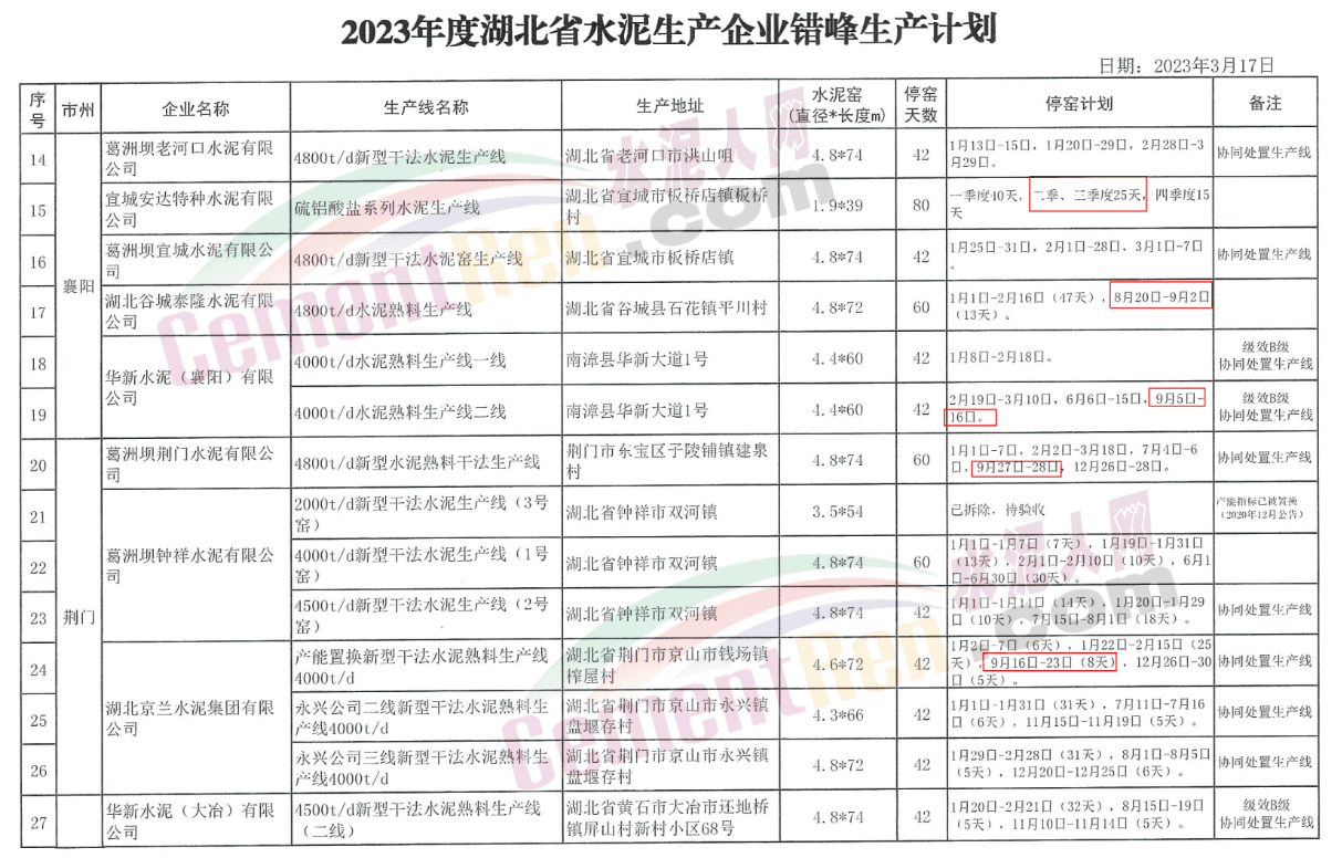 湖北省水泥生產(chǎn)企業(yè)2023年度錯峰生產(chǎn)計劃顯示,22家水泥企業(yè)23條熟料線三季度將涉及停窯限產(chǎn)。其中明確于9月份停窯限產(chǎn)的10家企業(yè)停窯時間從2天至18天不等。