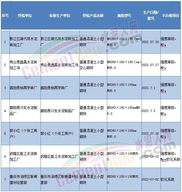 今年8月15日重慶市市場(chǎng)監(jiān)督管理局發(fā)布的通告文件顯示,抽查涉及黔江區(qū)、彭水縣、酉陽(yáng)縣、秀山縣、涪陵區(qū)、武隆區(qū)、石柱縣等7個(gè)區(qū)縣的48批次普通混凝土小型砌塊產(chǎn)品中,發(fā)現(xiàn)7批次產(chǎn)品不合格。不合格項(xiàng)目涉及軟化系數(shù)、強(qiáng)度等級(jí),不合格率達(dá)14.58%。