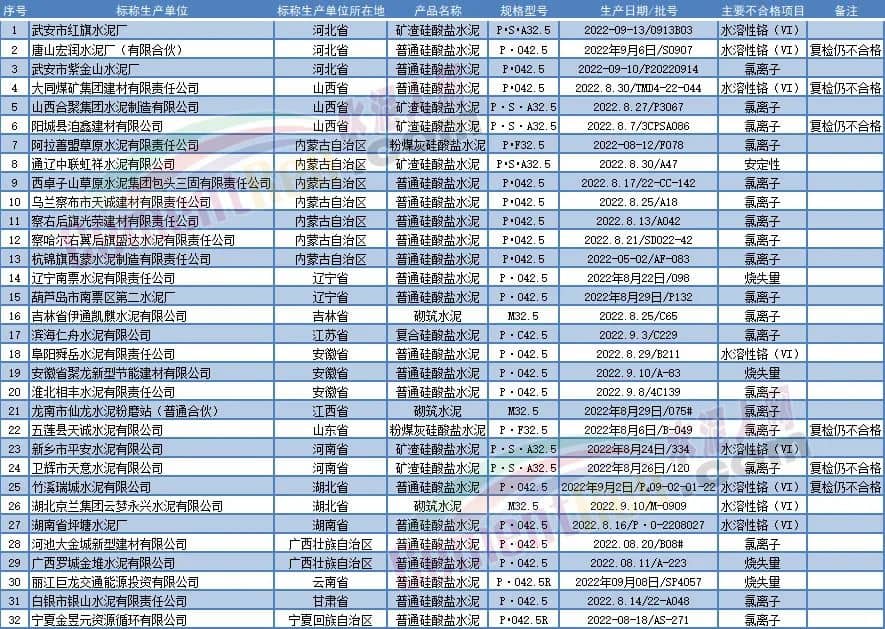另?yè)?jù)了解,4月6日,市場(chǎng)監(jiān)管總局通報(bào)2022年建筑材料產(chǎn)品質(zhì)量國(guó)家監(jiān)督抽查情況顯示,共抽查28個(gè)省(區(qū)、市)961家企業(yè)生產(chǎn)的961批次水泥,發(fā)現(xiàn)32批次產(chǎn)品不合格,不合格項(xiàng)目涉及燒失量、氯離子、水溶性鉻(Ⅵ)、安定性等,其中8批次水溶性鉻和19批次氯離子不合格,在問(wèn)題水泥中占比相對(duì)較高。