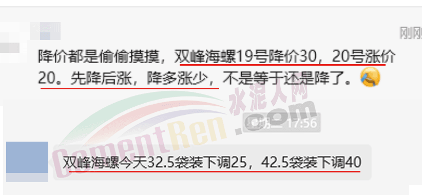 當(dāng)?shù)匾唤?jīng)銷商反饋稱,“雙峰海螺19日降價(jià)30元/噸,20日又通知漲價(jià)20元/噸。先降后漲,降多漲少,漲也是降啊!”