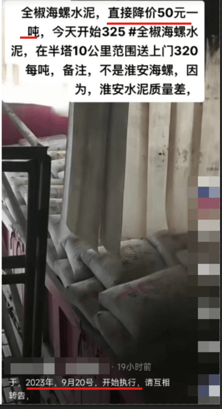 9月20日晚間,海螺水泥一經(jīng)銷商發(fā)消息稱,“全椒海螺水泥直降50元/噸,自當(dāng)日開(kāi)始,32.5全椒海螺水泥在半塔10公里范圍內(nèi)送貨上門320元/噸。并備注稱,不是淮安海螺。”