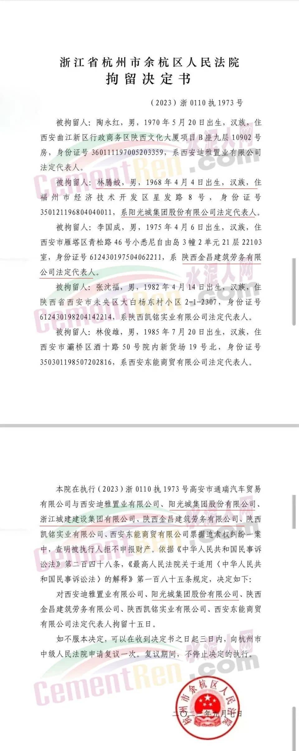 近日一份《浙江省杭州市余杭區人民法院拘留決定書》在業內流傳,有五家公司的法定代表人被處以15日拘留,其中一名是陽光城集團股份有限公司法定代表人林騰蛟。該《決定書》的落款時間為2023年9月7日。該事件的起因是一起票據權追索糾紛。