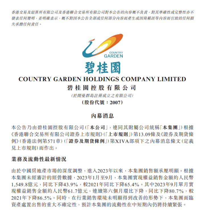 同日,碧桂園發布一則積極推進境外債務管理措施,制定整體解決方案的公告。碧桂園表示,進入2023年以來,銷售額承壓明顯,今年1至9月,銷售金額1549.9億元,同比下降43.9%,在行業銷售未明顯得到改善的形勢下,預計流動性在中短期內仍將持續緊張。
