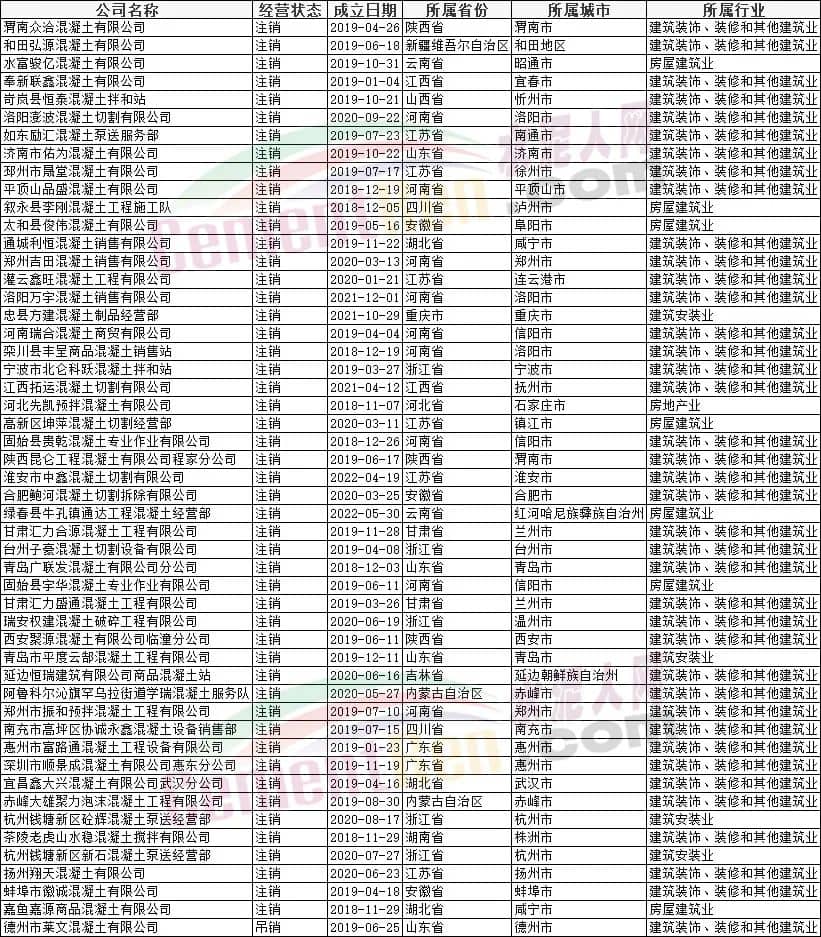 近5年成立,名稱中有“混凝土”字樣,所屬行業為房地產、房屋建筑業、建筑安裝業、建筑裝飾、裝修和其他建筑業,目前狀態是吊銷、注銷、撤銷的企業共51家。
